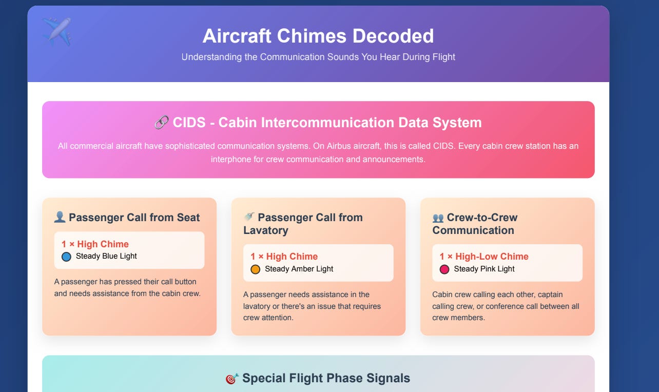 Cockpit Chimes and Beeps Those chimes you hear throughout the flight are simply the crew's intercom system. All commercial aircraft have a cabin communication system - on Airbus aircraft, this is called CIDS (Cabin Intercommunication Data System). At every cabin crew station where the flight attendants sit, there's an interphone that allows cabin crew to communicate with each other, with the Senior Cabin Crew Member (SCCM), and with the flight crew. This system is also used for announcements.
