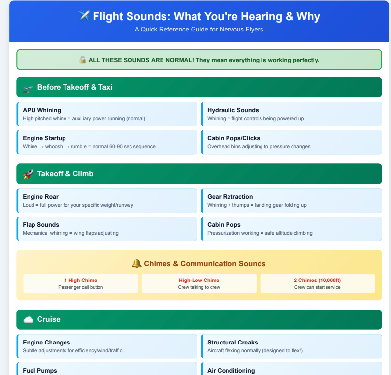 Download the FREE Flight Sounds Reference Guide HERE a simple infographic you can keep on your phone or print out. It explains what those chimes and noises mean, so you're never left wondering midair, or the Aircraft Chimes Decoded HERE